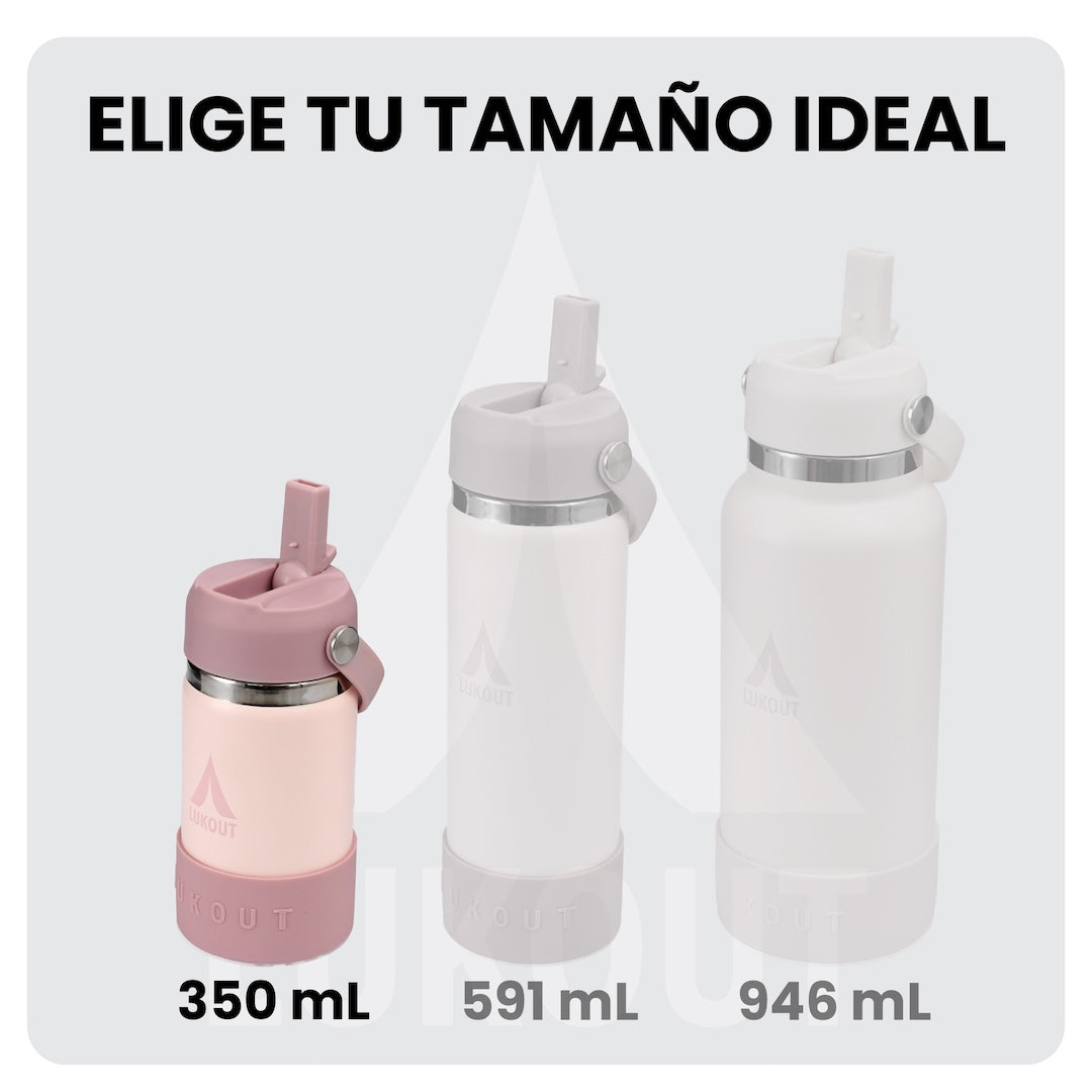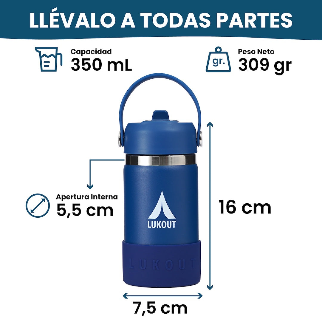 Pequeña pero poderosa, la botella LUKOUT de 350ml mantiene fría tus bebidas hasta por 24 horas. Es ideal para niños, cuando termina el tiempo de juego, su bebida fría te estará esperando. Fabricada en acero 304SS 100% Inoxidable de ultra resistencia. La tapa bombilla no es a prueba de fugas y no está diseñada para usarse con líquidos calientes.