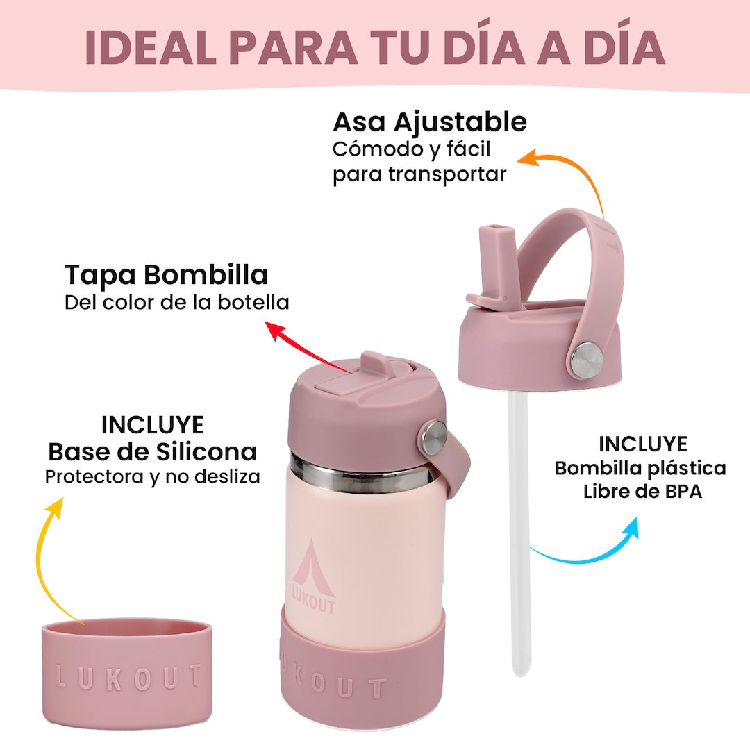 La botella térmica LUKOUT de 350 ml está pensada especialmente para los más pequeños. Con un diseño práctico y seguro, cuenta con bombilla incorporada y cuerpo de acero inoxidable 304 de grado alimenticio que mantiene las bebidas a la temperatura ideal por más tiempo. Perfecta para acompañar cada día con diversión, comodidad y confianza.