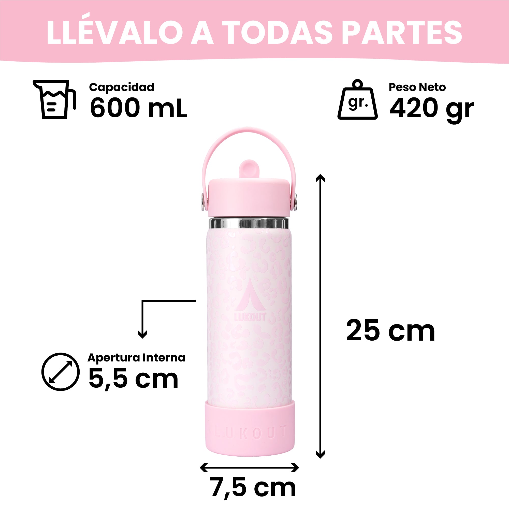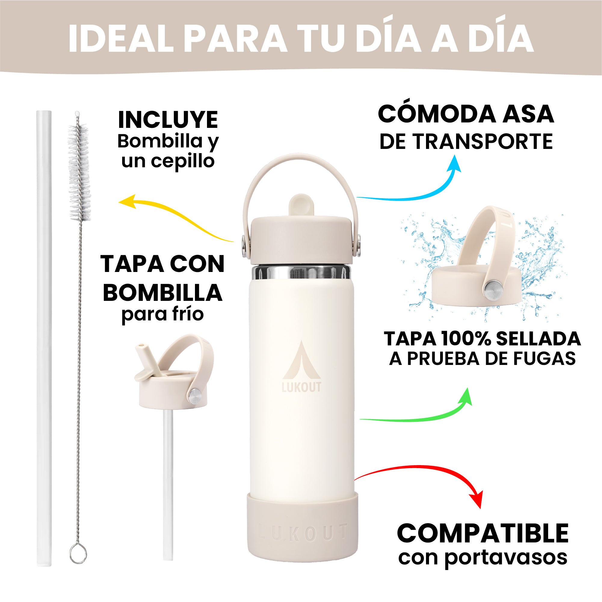 La botella LUKOUT Expedition de 600 ml mantiene tus bebidas frías por 24 horas y calientes por 12 horas. Es perfecta para el día a día. Cuenta con doble pared de acero con tecnología LukTemp, y está fabricada en acero inoxidable 304 de ultra resistencia. Incluye dos tapas: una con bombilla para beber rápido y otra 100% sellada, ideal para frío y caliente. La tapa bombilla no es apta para líquidos calientes.