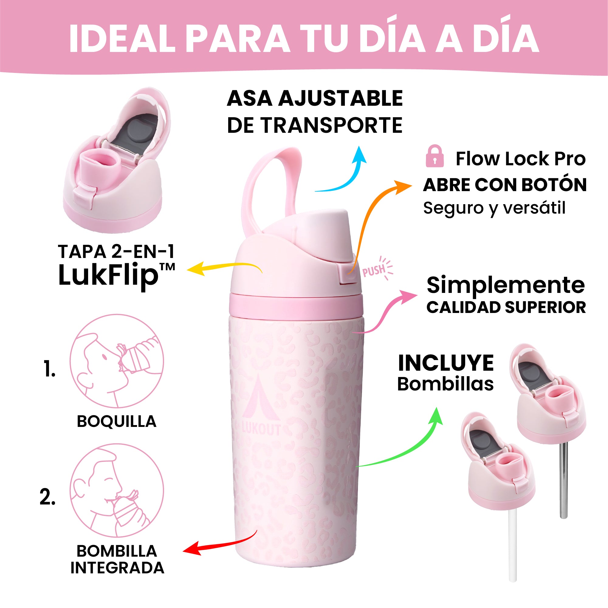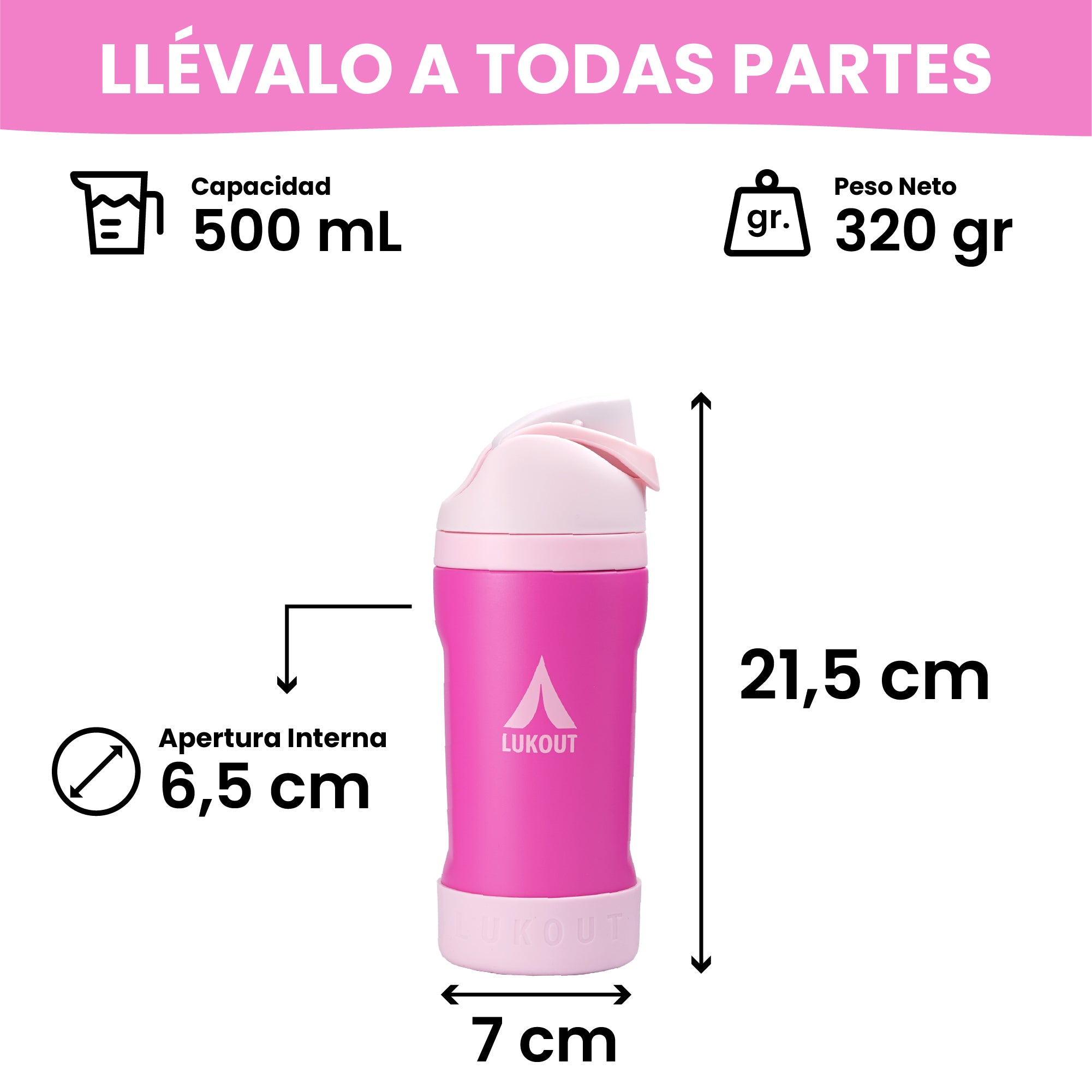 La botella LUKOUT Flip de 500 ml es más liviana y resistente, perfecta para cualquier aventura. Por su tamaño es ideal para niños de 10 años y adultos que necesiten comodidad, ligereza y mantener el agua o bebida favorita frías por hasta 24 horas gracias a su doble pared de acero al vacío. Su tapa LukFlip™ es ergonómica y 2-en-1, para beber cómodamente con bombilla incorporada o directamente desde la boca, adaptándose a cada momento. La tapa LukFlip™ no está diseñada para ser utilizada con líquidos calientes.