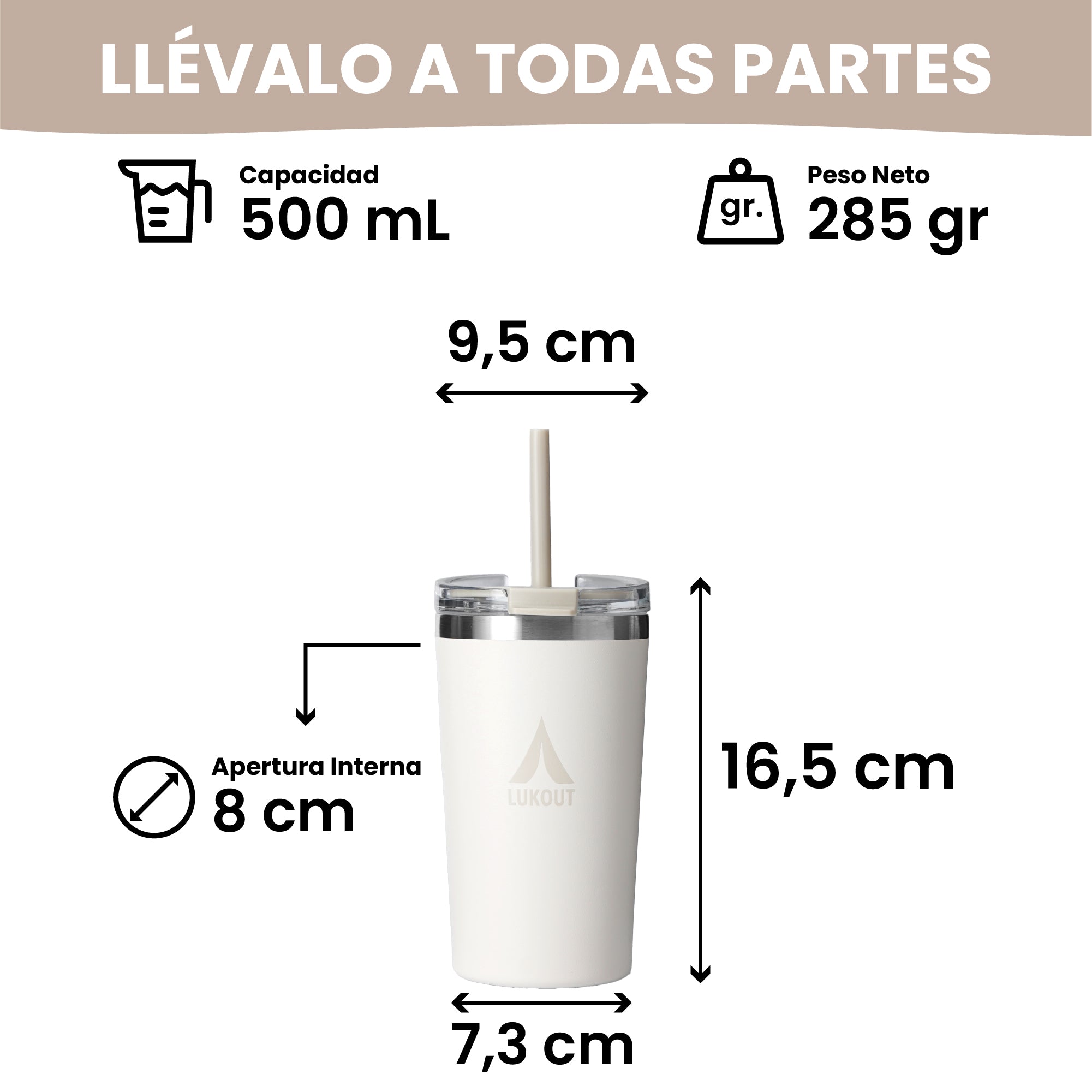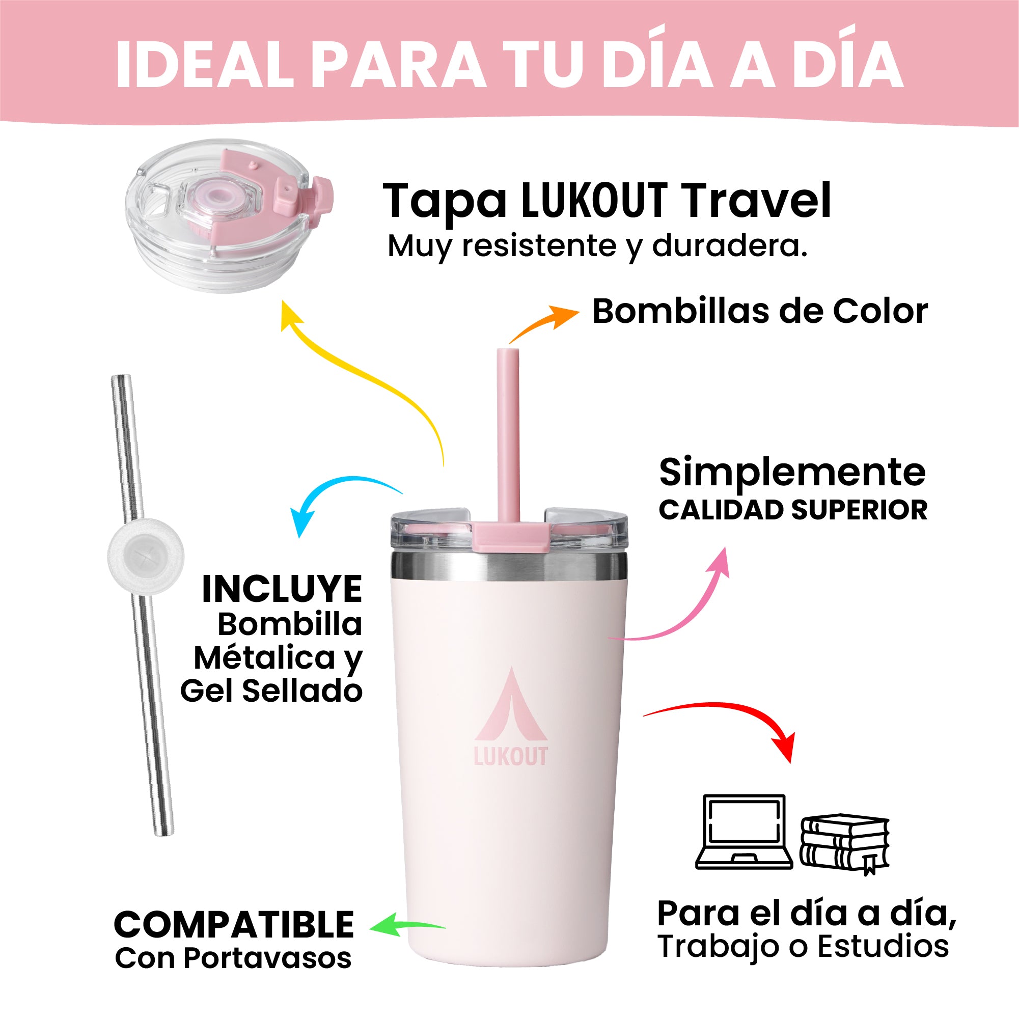El vaso térmico LUKOUT Travel de 500 ml mantiene tus bebidas frías por 12 h y calientes por 3 h, ideal para casa, oficina o viajes. Es apto para la mayoría de portavasos. Su diseño incluye un agujero para bombilla y una apertura para bebidas calientes, asegurando comodidad en cada sorbo.