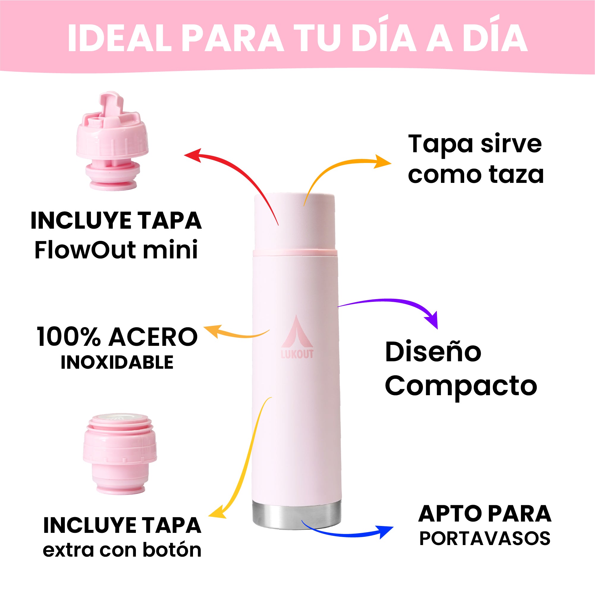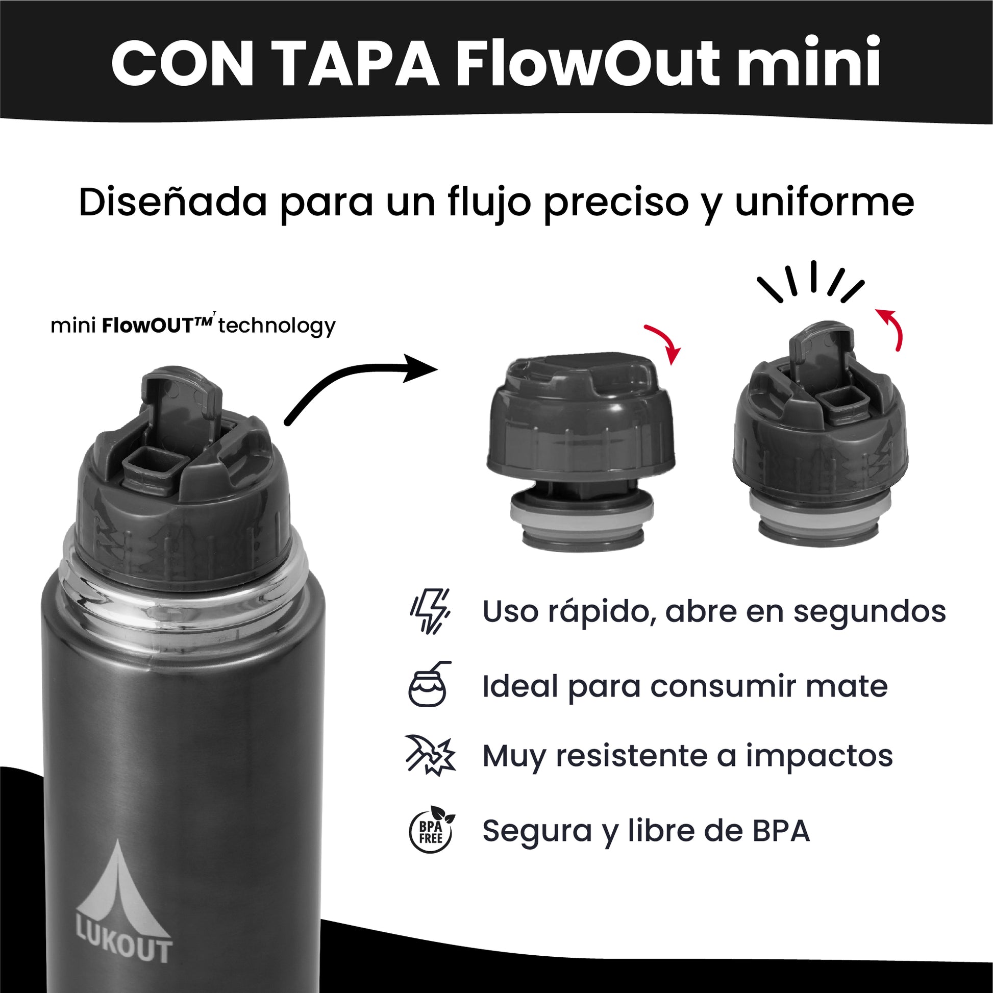 El Termo Bala Pro LUKOUT 750 ml destaca por su diseño slim tipo bala, compacto y ultra-transportable, sin sacrificar capacidad. A pesar de su formato ligero, mantiene las bebidas calientes hasta 7 horas y frías hasta 24. Incluye tapa FlowOut mini para cebar el mate de forma precisa o servirte un té, café o tu bebida favorita en su tapa-taza del termo, y una tapa con botón clásica de termo, adaptándose a distintos usos. Ideal para aventuras al aire libre, viajes o uso diario, es el termo perfecto para llevar a cualquier parte sin ocupar espacio.
