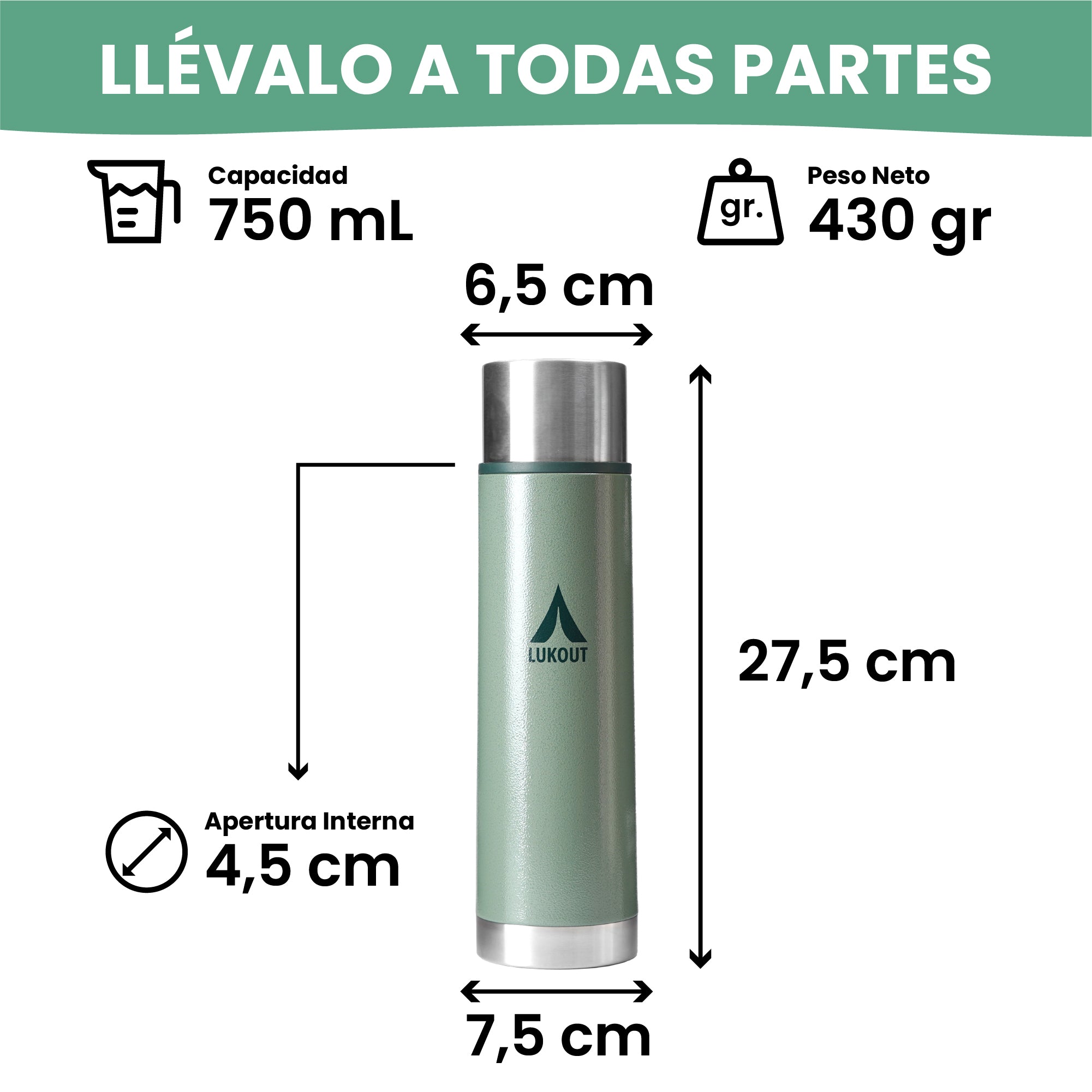 El termo bala de 750ml de LUKOUT esta especialmente diseñado para acompañarte en cada aventura y paso del camino, su diseño compacto lo hace especialmente ideal para transporte ligero y sin complicaciones. Fabricado en acero inoxidable 304 es resistente y duradero, tu compañero de aventuras, viene con dos tapas adicionales, una de pico cebador y otra de botón con válvula para que disfrutes tus bebidas de la manera que tú quieras.