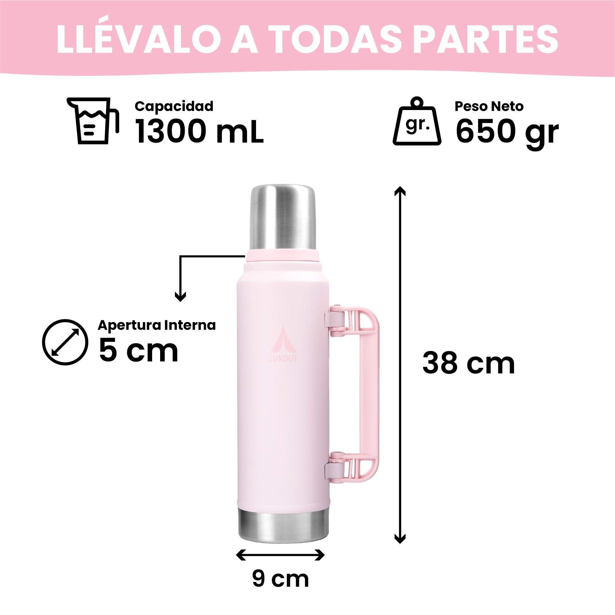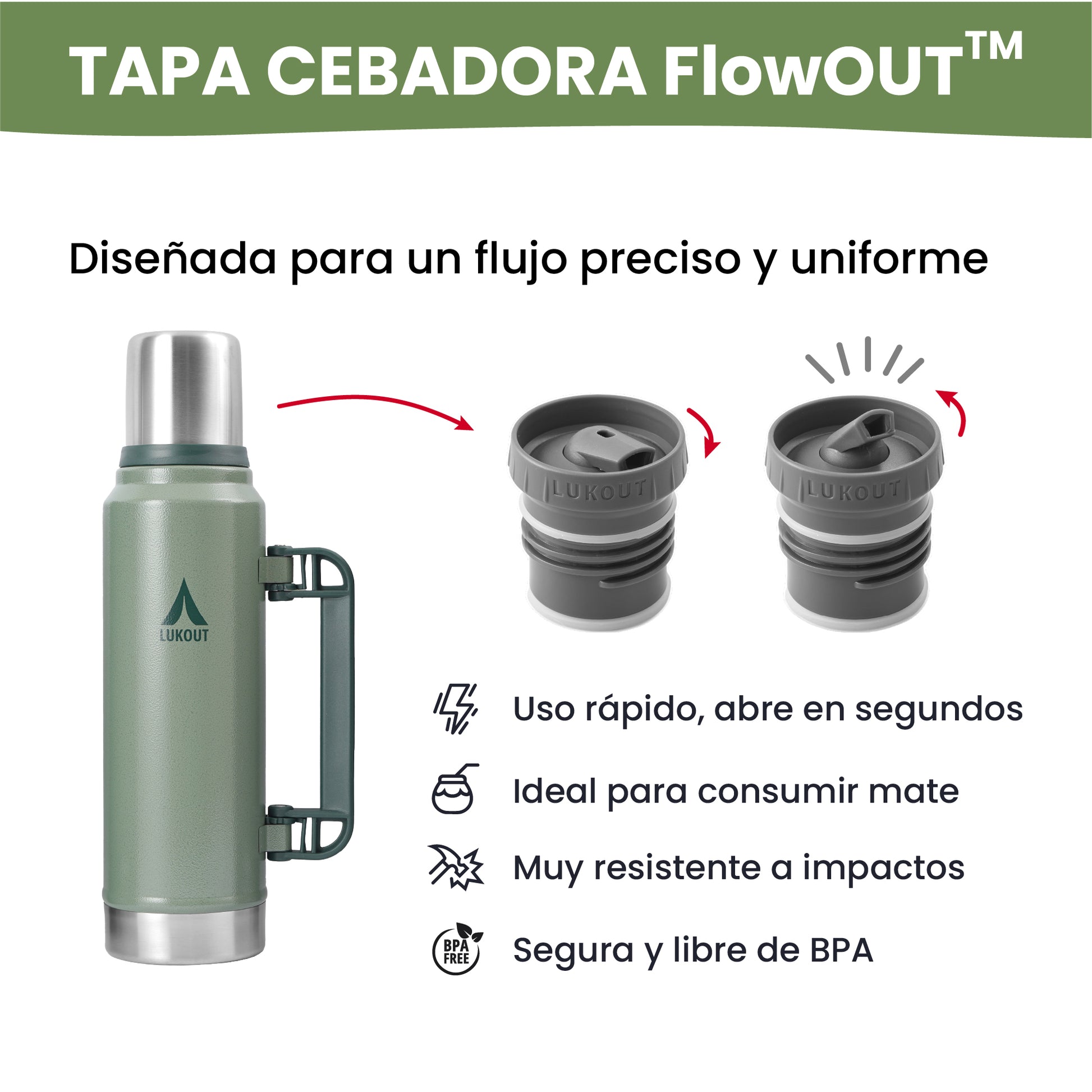 El Termo FlowOut de 1300 ml de LUKOUT es la combinación perfecta de capacidad y rendimiento. Diseñado para los amantes del mate o café y las aventuras al aire libre, mantiene tus bebidas calientes hasta 17 horas y frías hasta 34 horas. Incluye dos tapas intercambiables: una tapa cebadora, ideal para un vertido rápido, y una tapa Flow Out, perfecta para servir con mayor precisión. Es el compañero ideal para cualquier viaje o jornada larga.