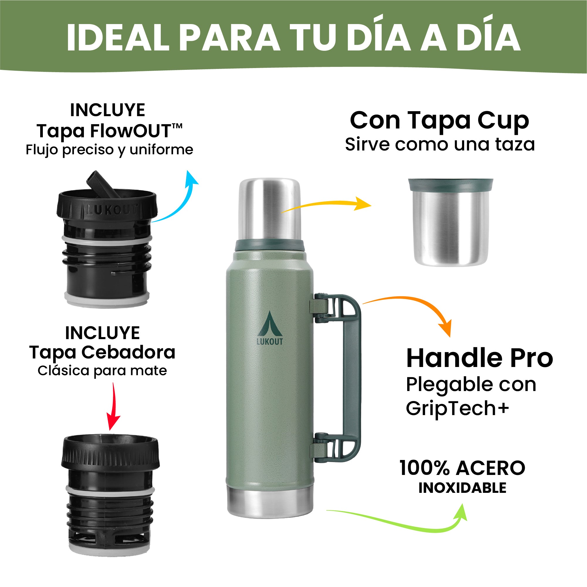 El Termo FlowOut de 1300ml es el clásico termo de LUKOUT, con un mango sólido y soldado al cuerpo del termo, permite un agarre cómodo y ergonómico. Frío o caliente todo el día, hasta 34 horas frío y 17 horas caliente. Es tu compañero de aventuras diario para todo lo que necesites, café, bebidas frías, té, mate o agua caliente, lo que tu quieras. Está fabricado en acero inoxidable ultra resistente, te durará toda una vida. Cuenta con una tapa cebadora clásica y una tapa FlowOut diseñada para un flujo preciso.
