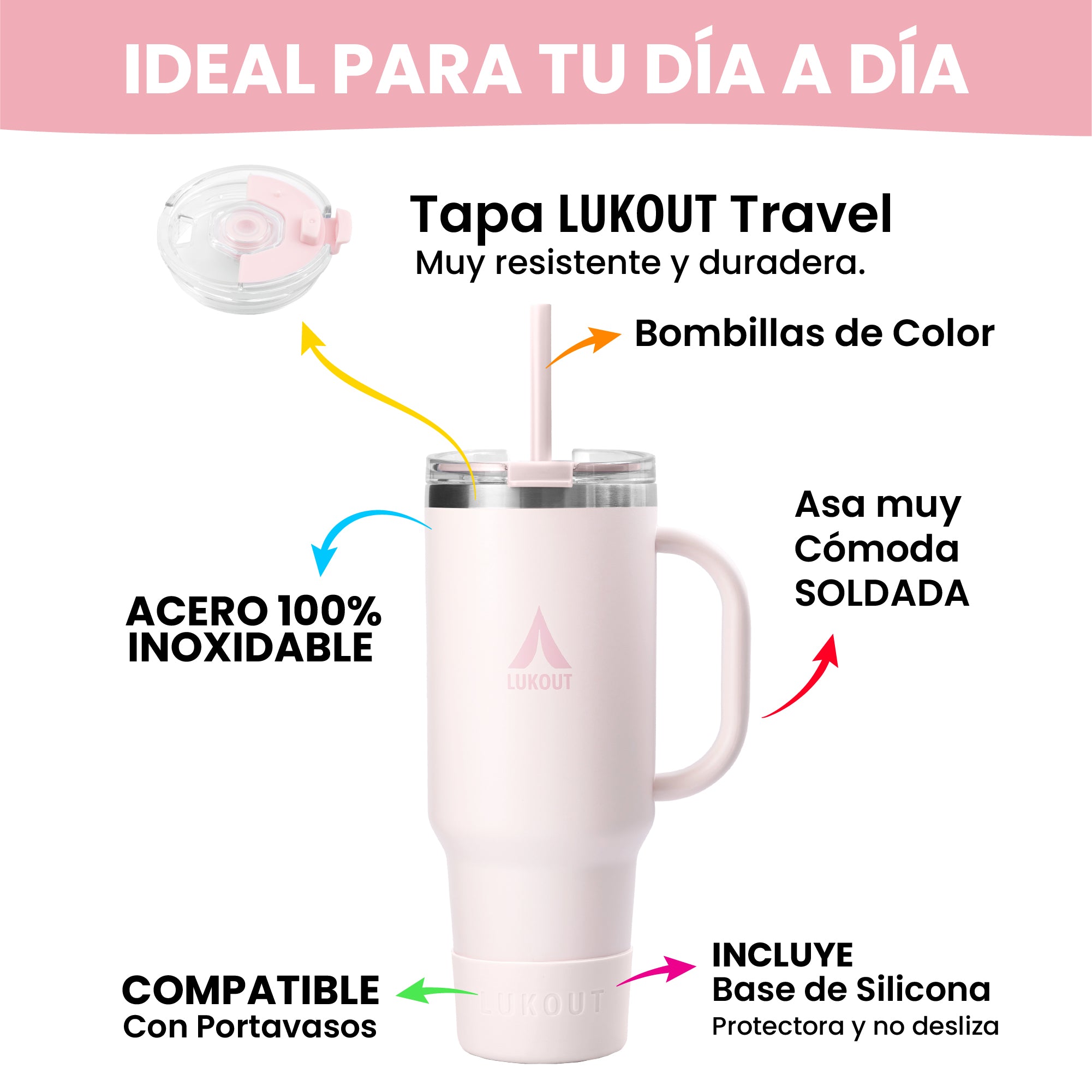 El vaso térmico LUKOUT Travel de 1200 ml mantiene tus bebidas frías por 24 h y calientes por 6 h, ideal para casa, oficina o viajes. Es apto para la mayoría de portavasos. Su diseño incluye un agujero para bombilla y una apertura para bebidas calientes, asegurando comodidad en cada sorbo. Tan resistente y elegante. Muy Pro.